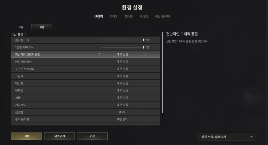 이러한 근거는 배틀그라운드 뿐만 아니라 다른 게임들의 선수들의 세팅값을 보아도 알 수 있어요. 대체로 선수들은 최상의 프레임을 얻기 위해서 모든 옵션을 낮추는 경우가 많습니다. 그렇기에 배틀그라운드 설정도 동일하게 전반적인 그래픽 품질을 ‘매우 낮음’으로 해주는 게 좋습니다.