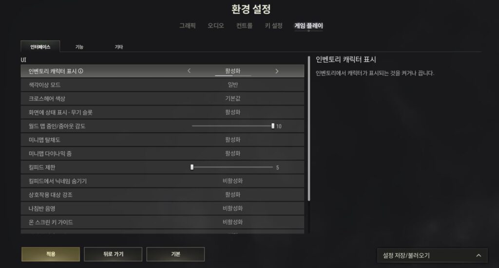 그래픽 설정은 끝났습니다. 하지만 한 가지 부가적인 사항이 더 있는데요. 게임 플레이 탭으로 가시면 맨 위에 ‘인벤토리 캐릭터 표시’ 창이 있는 것을 확인하실 수있습니다. 이는, 아이템 창을 열었을 때 자신의 캐릭터가 보이는 그 화면 상태를 이야기 하는 것인데요. 해당 설정 끄시는 것이 좋습니다.