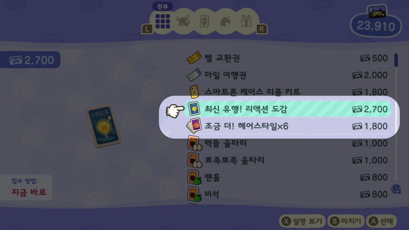 새로운 9종의 리액션을 배울 수 있는 도감. 사진 찍을 때, 온라인 멀티플레이를 즐길 때, 섬 주민들과 교류할 때 써먹기 좋을 듯 싶다. 마일 2,700포인트로 교환 가능하다.