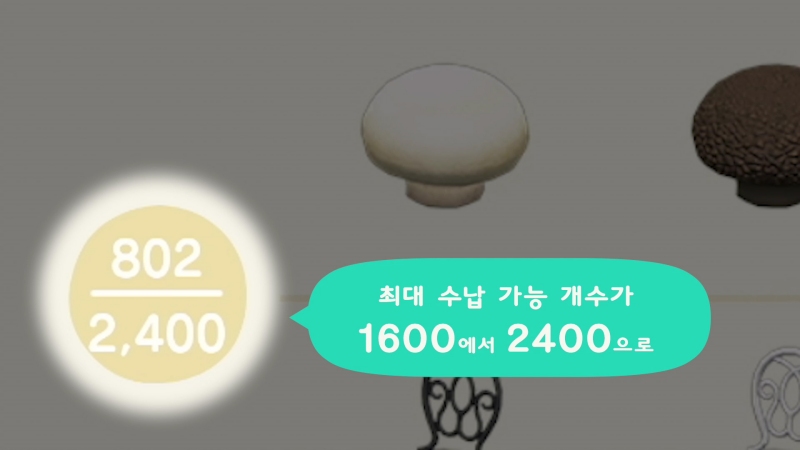 좁디 좁은 창고 때문에 고통받았다면 이번 업데이트 덕분에 해결될 수 있을 것으로 보인다. 마이 홈 최대 증축 기준 창고 갯수는 현재 1600개에서 2400개로 늘어난다. 다만 너굴에게 ‘수납 공간 확장’을 요청해야 한다고. 이번엔 또 얼마나 받아먹을 생각이냐 너굴놈…