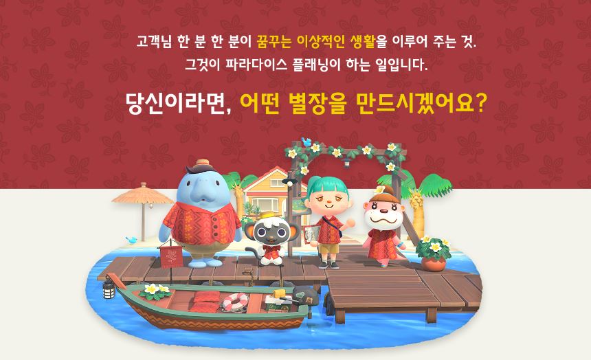 이어서 스토리를 간단히 설명 드리자면, 플레이어는 너굴의 추천으로 휴양지 제도의 리조트 개발 사무소에서 ‘파라다이스 플래닝’ 직원으로 일하게 됩니다. 이곳에서 솜이, 방글, 너티와 함께 리조트 손님들을 위해 별장 인테리어를 꾸미게 되는데요.