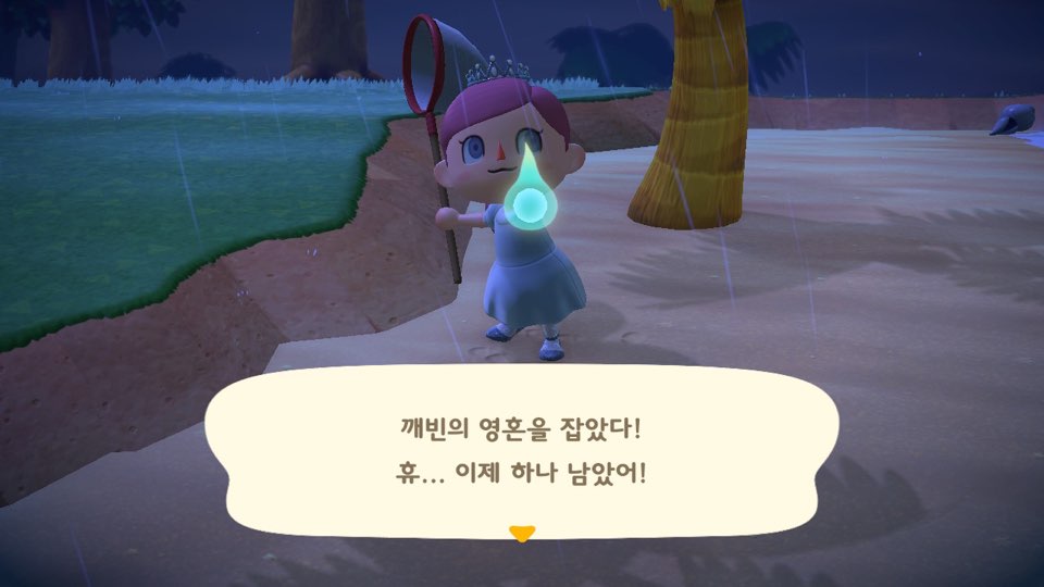 영혼 조각은 섬 곳곳에 떠다니고 있어서, 해안가/나무 뒤/건물 주변 등을 꼼꼼히 찾아야 해요. 여기저기 흩어진 영혼 조각 5개를 잠자리채로 잡아 깨빈에게 가져다주면 보상을 주는데, 이때 두 개의 선택지를 줍니다.
