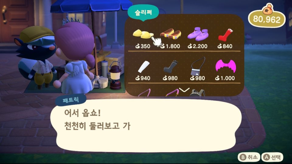 이런 패트릭을 더 자주 보고 싶다면 파니의 섬 광장에 초대하는 방법이 있는데요! 근사한 신발과 가방을 파는 상인을 초대하기 위한 모금을 진행하면, 패트릭이 섬에 오지 않는 날에는 파니의 섬 광장에서 상시로 장사를 하게 됩니다.