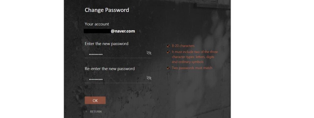 위 과정을 모두 하셨다면 사용할 이메일의 패스워드를 재설정 할 수 있는 창이 나타나게 됩니다. 해당 과정을 거치면 아레나 브레이크아웃 베타키를 받은 선정자인지에 대한 여부를 확인하실 수가 있습니다.