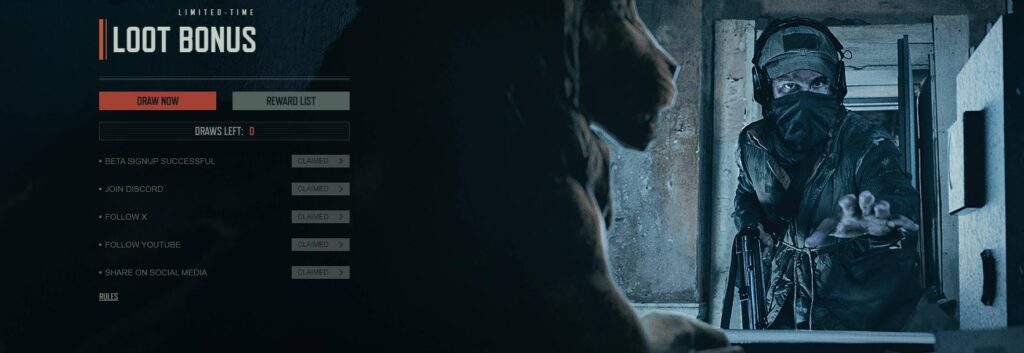 사이트에 접속하여 로그인 한 뒤, 아래로 스크롤해보면 위 사진처럼 ‘LOOT BONUS’라는 부분이 보입니다. 일종의 경품 응모인 것인데, 해당 버튼들을 클릭하기만 해도 응모권이 주어집니다. 클릭만으로 총 5개가 주어지는데, 이 응모권을 이용하면 하나의 계정당 베타키 응모에 무려 5번의 기회가 생기는 것입니다.