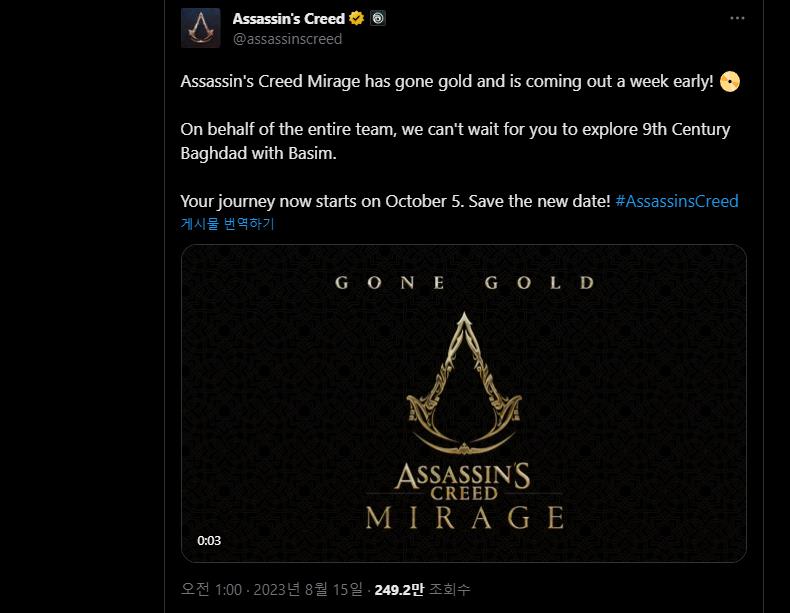 지난 8월 15일 어쌔신 크리드 측의 트위터에서 어쌔신 크리드 미라지의 골드행을 알리는 글을 게시하였습니다. 이들에 따르면 한 주 정도 더 빠르게 게임을 만나볼 수 있을 것이라고 하는데요. 유저들이 9세기 이슬람 황금기의 바그다드를 경험하게 되는 순간이 매우 기대된다고 합니다. 이들에 따르면 유저들의 여정은 10월 5일에 시작될 것이라고 합니다. 그런데 골드행이 도대체 무엇일까요? 맥락 상 이미 눈치를 채셨겠지만 조금 더 빠르게 게임을 출시할 수 있게 되었다는 의미로 쓰이는 말이라고 전해지고 있는데요. 이 말은 게임계에서 자주 쓰이는 말로 알려져 있습니다.