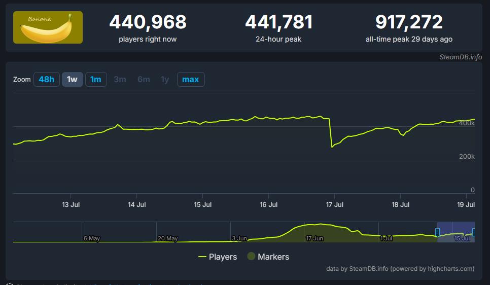 앞서 이야기 한 충격적인 부분은 바로 동접자입니다. 평상시 44만 명이나 바나나 게임을 하고 있는데요. 올타임 피크에는 917,272명이나 기록했을 만큼 상당한 기세를 보여주었다고 볼 수 있을 것 같습니다.