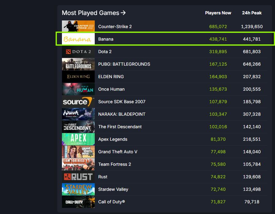 항상 상위권을 유지하던 도타 2도 바나나 게임에 밀리는 모습을 보면 경이롭다 표현할 수 있을 것 같네요.