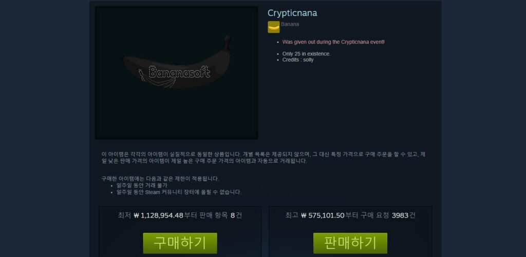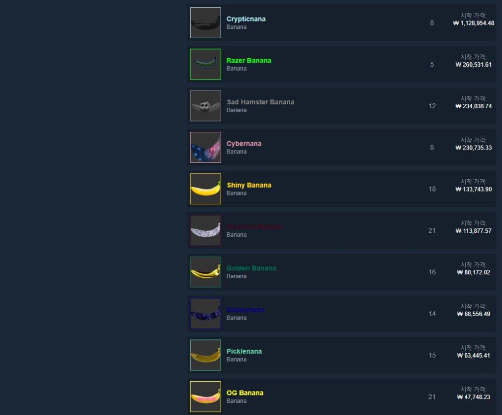 3시간에 한 번씩 일반 등급의 바나나를 얻을 수 있으며, 18시간에 한 번씩 레어 등급의 바나나를 얻을 수 있습니다. 그리고 이렇게 얻은 바나나는 스팀 장터 기능을 통해서 유저들과 거래할 수 있는데요. 현금 거래가 되고 있기에 많은 유저들이 플레이 중입니다.