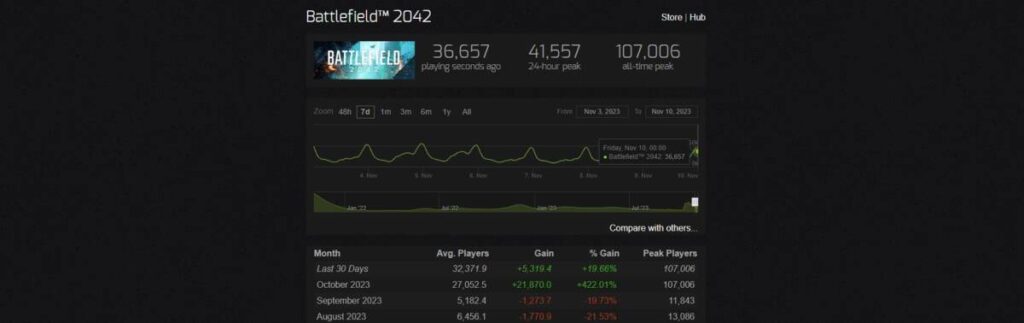 우선 위 사진부터 보겠습니다. 2023년 11월 10일 오전 12시를 기준으로 3만 6천명이 실시간으로 플레이 하고 있는 것을 보실 수 있습니다. 최근에 파격적인 할인과 더불어 여러 차례 업데이트를 거치면서 많은 유저를 섭렵한 것으로 보이는데요. 더불어 주말 무료까지 진행하면서 유저수는 극대화 되었습니다. 아무래도 차기작 제작에 돌입했기 때문에 배틀필드 2042로 벌어들일 수 있는 것은 최대한 끌어모아 손실을 만회해야 하기에, 이러한 움직임을 보이는 것 같은데요.