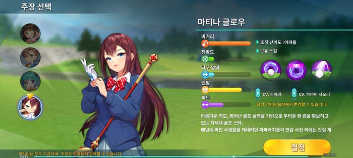 게임 시작 후 튜토리얼을 진행하다보면 네 명의 캐릭터 중 주장을 맡을 캐릭터를 한 명 결정해야 한다. 주장은 나중에 얼마든 바꿀 수 있으니 능력치에 상관없이 일단 마음에 드는 캐릭터를 선택해도 좋다. 다만, 좀더 효율적으로 진행하고 싶다면 비거리가 긴 마티나를 선택해 아이템과 장비가 적은 초보시절 타수를 줄이는데 도움을 주자.