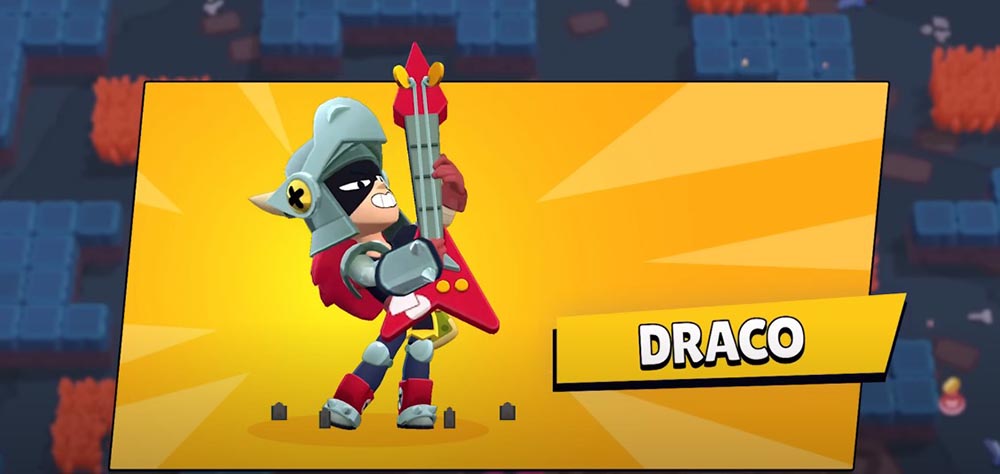 또 하나의 신규 브롤러, ‘드라코‘입니다. 드라코는 이번에 새로 등장한 ‘매드이블 저택’이라는 신규 스타 파크 구역에 속해있는데요. 근거리 브롤러로서 기타를 휘둘러 피해를 주며, 최대 삿거리에서 적을 타격하면 더 큰 피해를 줄 수 있습니다.