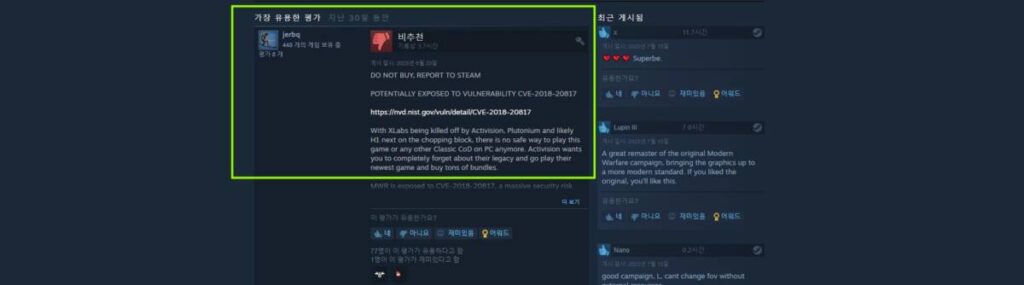 현재 콜 오브 듀티 모던워페어 리마스터 리뷰를 보면, 어떤 외국 유저가 이 게임을 사지 말라고 이야기 하는 것을 볼 수 있습니다. 심지어 이러한 비판의 글은 많은 추천수를 받았기 때문에 ‘가장 유용한 평가’로 등재되었죠. 때문에 상점 페이지에서 콜 오브 듀티를 찾아보는 모든 유저들이 이 글을 볼 수 있는 것인데요. 그에 따르면 해당 게임은 보안 취약점이 존재하여 해킹당할 수 있는 위험이 존재한다고 합니다. 때문에 사지 않거나 멀티플레이로 즐기지 말 것을 강조합니다.