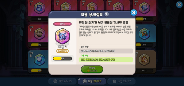 새로운 보물인 ‘전장의 의지가 남은 불굴의 기사단의 증표’ 와 조합해야 더욱 강력해지니 실론나이트 쿠키를 키울 생각이라면 길드 뽑기를 열심히 해 주자. 공격력은 높지만 체력, 방어력이 낮은 편이기 때문에 실론나이트 쿠키 토핑으로는 아몬드 5개를 둘러주되, 부옵으로 쿨감과 공격력을 챙기자.