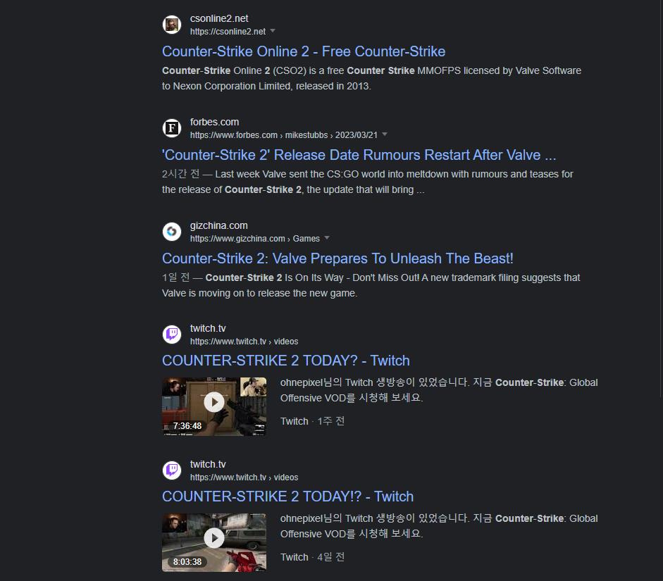 위 사진은 구글에서 카운터 스트라이크 2에 대해 검색했을 때 나오는 다양한 정보들입니다. 게임을 업으로 하는 스트리머들부터 시작하여, 각종 해외 게임 매거진 등이 카운터 스트라이크 2에 대한 이야기를 하고 있는 상태죠. 무엇 하나 제대로 밝혀진 것이 없는 현 상황, 공식적인 정보가 없다 보니 여러 가지 가짜 정보도 판을 치고 있는 상태입니다.