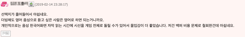 CDPR은 지난 2018년 애초에 한국어 더빙 계획을 발표하면서 국내 유저들을 기대시켰지만 이후 더빙 계획을 취소한 바 있다.