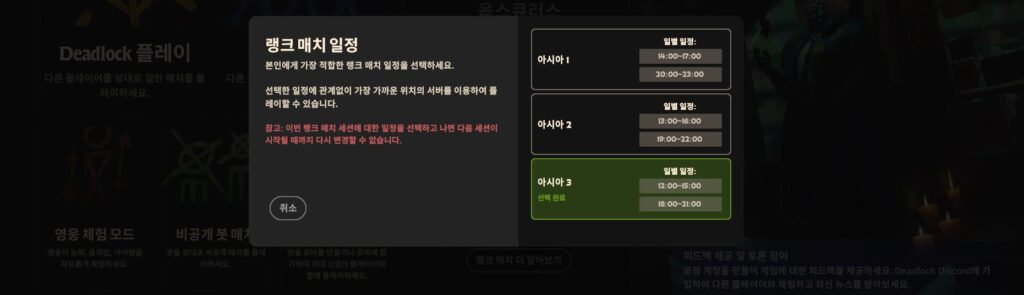 하지만 길게 운영되는 건 아니기 때문에 랭크 매치를 위해서는 해당 시간대에 일정을 비워야 하는 수준인데요. 한 번 설정한 일정은 다음 세션까지 변경이 불가능하니 꼭 신중하게 결정하셔야합니다. 현대인의 패턴을 고려하면 아시아 1이나 2를 추천합니다.