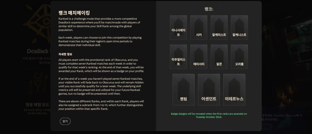 “Answer is Obscurus !” 데드락 랭크도 다른 게임들처럼 배치고사가 준비되어있습니다! 총 7판을 플레이 하면 자신의 티어를 알 수 있게 되는데요. 그 전에는 옵스큐러스라고 나옵니다. 게임에 등장하는 용어 대부분이 영어, 라틴어 등과 밀접한 관련이 있다 보니 이러한 설명이 직관적이지 않을 수 있는데요.