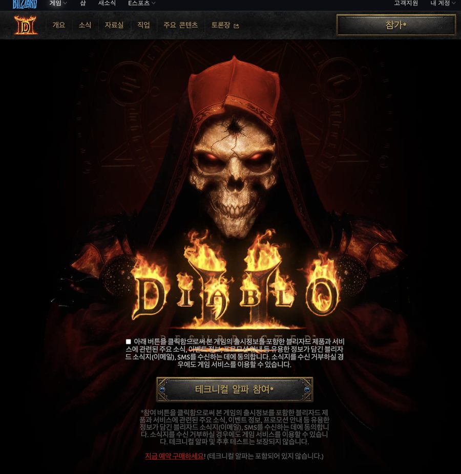 올해 말, 또는 그보다 빠르게 출시될 수 있다고 알려진 ‘디아블로2 레저렉션’을 앞서 해볼 수 있는 방법도 있다. 공식 홈페이지를 통해 테크니컬 알파 테스터로 참가하는 것. 신청 자격은 1. 배틀넷 계정 보유자 그리고 2. 미성년자가 아닌 자 두 가지다.