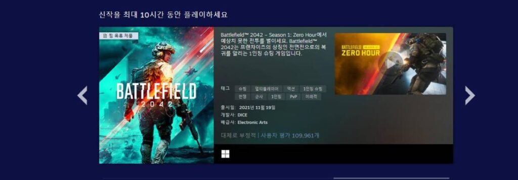 현재 배틀필드 2042가 할인중에 있는데도 불구하고 유저들의 반응은 차갑죠. 아무래도 배틀필드 V 처럼 어느 순간부터 사후지원을 중단한 채 다음 시리즈를 만들까봐 그런 것 같은데요. 뿐만 아니라 악평이 자자하기 때문에 쉽사리 다가가지 못하는 점도 이유로 작용하는 것 같습니다. 하지만 이번 이벤트를 통해서 그러한 걱정없이 마음 편히 즐겨볼 수 있으니 더할 나위 없는 좋은 기회라 볼 수 있을 것 같습니다.