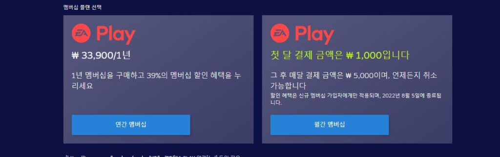 다시 한 번 강조드리지만, EA Play 구독은 ‘신규 멤버십 가입자’ 에게만 한정되는 이벤트입니다. ‘첫 결제’ 가 아닌 분들은 해당 사항이 없기 때문에 이전에 결제하신 분들은 이용하실 수 없습니다. 게다가 1달간만 적용되는 금액이기 때문에 이 점 또한 유의하시어 이용하시기 바랍니다.