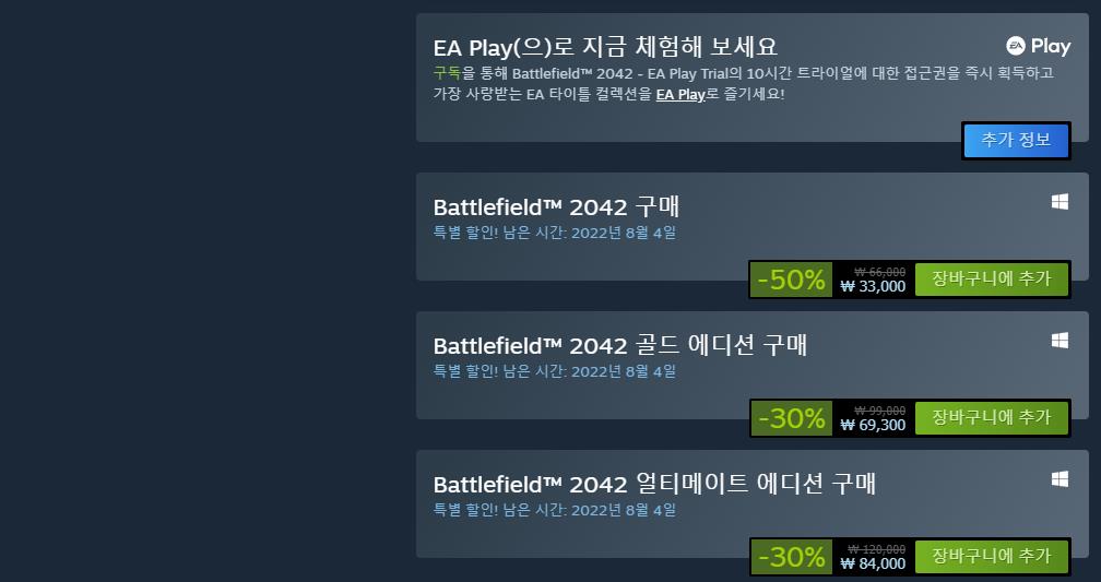 현재, EA Play 는 첫 구독자들을 위하여 트라이얼 차원에서 한 달 이용 가격을 1,000원만 받고 있습니다. 때문에 모든 배틀필드 시리즈는 물론이거니와 EA에서 배포되는 다른 게임들까지도 즐겨보실 수 있습니다. 방법은 정말로 쉽습니다. 스팀에 EA Play 를 검색해서 결제하시면 끝입니다. (오리진을 통해서도 가능하지만 스팀이 가장 대중적이기 때문에 해당 플랫폼을 기준으로 하여 작성하였습니다.)