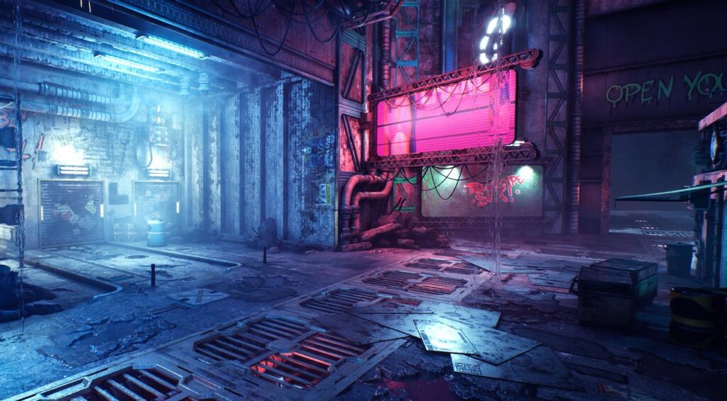 게임 스틸컷 두 장만 보셔도 느낄 수 있는 것처럼 SF 와 포스트 아포칼립스, 사이버 펑크가 섞인 게임입니다. 게임의 스타트는 대재앙이 시작 된 뒤 인류가 최후의 거주지로 정한 ‘다르마 타워’에서 이루어집니다. 이곳은 폭력과 가난으로 가득하여 늘 소음이 끊이질 않는 공간인데요. 이 한가운데에서 다르마 타워의 질서와 안위를 수호하는 것이 바로 고스트러너!