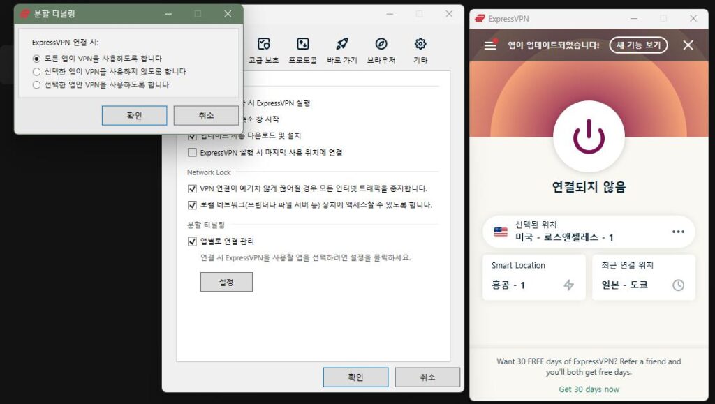 그렇기 때문에 가입을 할 때는 완전히 정돈되어 집중할 수 있는 상황에서 해주는 것이 좋은데요. 그것이 불가능하다면 위 사진처럼 분할 터널링 기능을 이용해주세요. 배틀 그라운드에 나오는 파란 자기장처럼, 특정 프로그램만 VPN 접속 하도록 만들어 주는 매우 좋은 기능입니다.