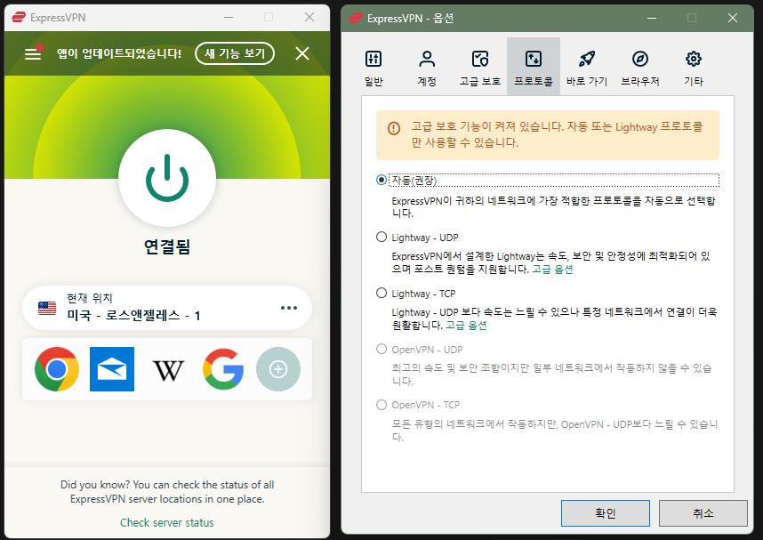 제가 사용하고 있는 ExpressVPN은 기본적으로 자동 설정이 되긴 하지만 사용자의 선호도에 따라서 다른 방식으로 사용할 수도 있습니다. 특히, 에픽게임즈 가입할 때 북미 서버를 이용하는 경우 기존 사용하시는 인터넷 속도와는 많이 차이가 나니 이 부분도 꼭 참고하세요.