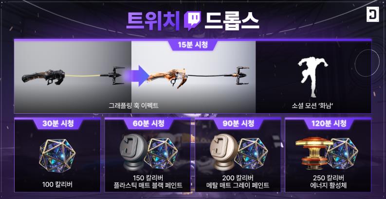 트위치 드롭스는 이제 여러 게임들에서 하고 있기 때문에 너무나도 익숙하죠. 게임 방송을 보면서 스트리머에게는 시청자수를 제공하고, 시청자는 그에 상응하는 보상을 얻게 되는 시스템입니다. 이 때문에 퍼스트 디센던트 유저들은 칼리버와 페인트, 에너지 활성체 등을 얻을 수가 있는데요.