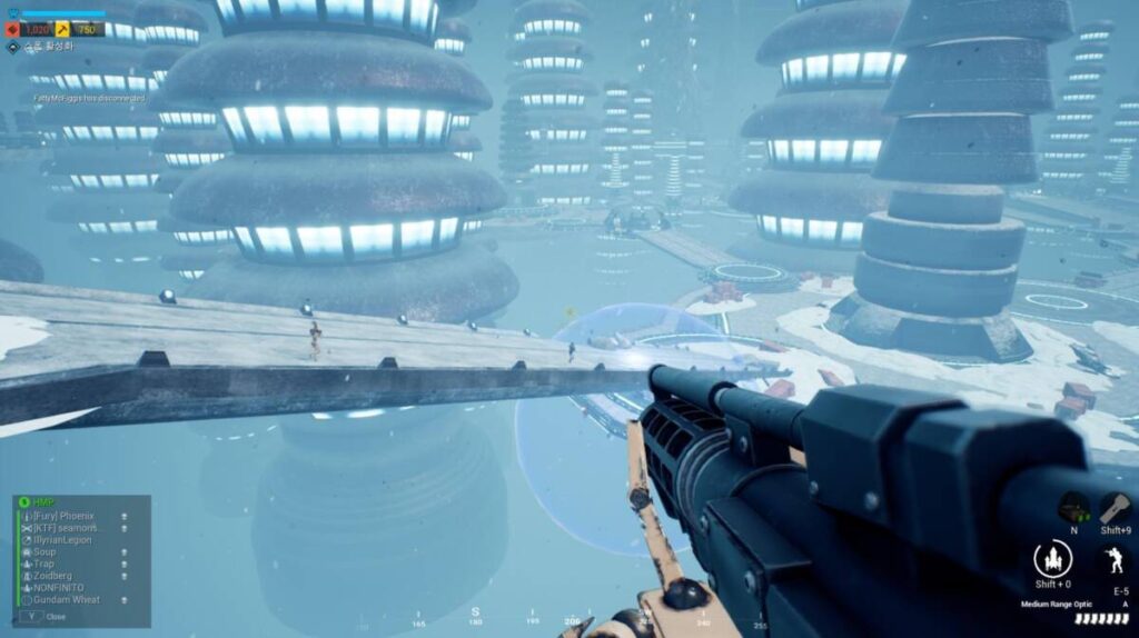 위 사진은 실제로 플레이 하던 중, ‘부스터 팩’을 사용하여 건널목을 우회하는 장면인데요. 건설된 구조물들을 제외한 나머지 공간은 우주 공간으로 인식되어서 추락사 혹은 실종사 처리 되는 방식으로 운영되던 맵입니다.