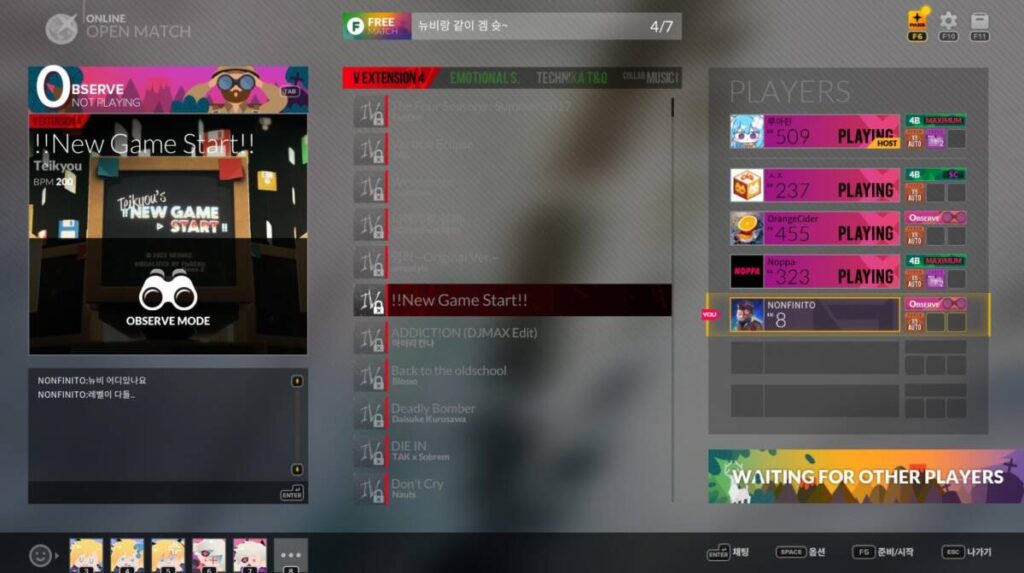 분명 ‘뉴비랑 같이 겜 슛~’ 이라는 제목의 방을 입장하였지만 백 단위의 레벨을 지닌 유저들을 볼 수 있었습니다. 사실 디제이맥스에서 이러한 일은 굉장히 흔한 경우입니다. 앞서 언급한 것처럼, 리듬 게임은 유저층과 진입장벽이 높은 축에 속하기 때문이죠.