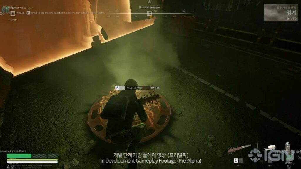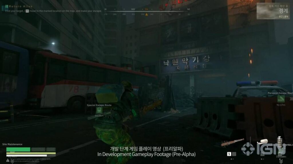 마지막은 탈출하는 모습으로 영상이 마무리가 되는데요. 그 와중에 유독 가스라고 불리는 자기장(주황색 막)이 다가오는 것을 볼 수가 있습니다. 아무래도 배틀 그라운드의 영향인 것 같은데, 서비스 종료한 베일드 엑스퍼트도 그렇고 자기장 시스템을 포기할 수 없는 이유가 있나 봅니다.