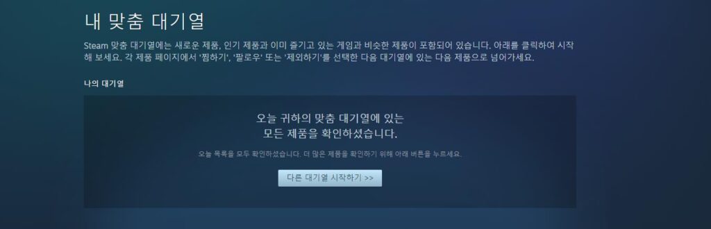 스팀에서 이루어지는 게임 추천은 하루에 한 번 가능합니다. 정확히는 하루 한 번 정도가 스팀에서 권장하는 정도이고, 원한다면 새로운 대기열을 이용할 수 있긴 합니다.