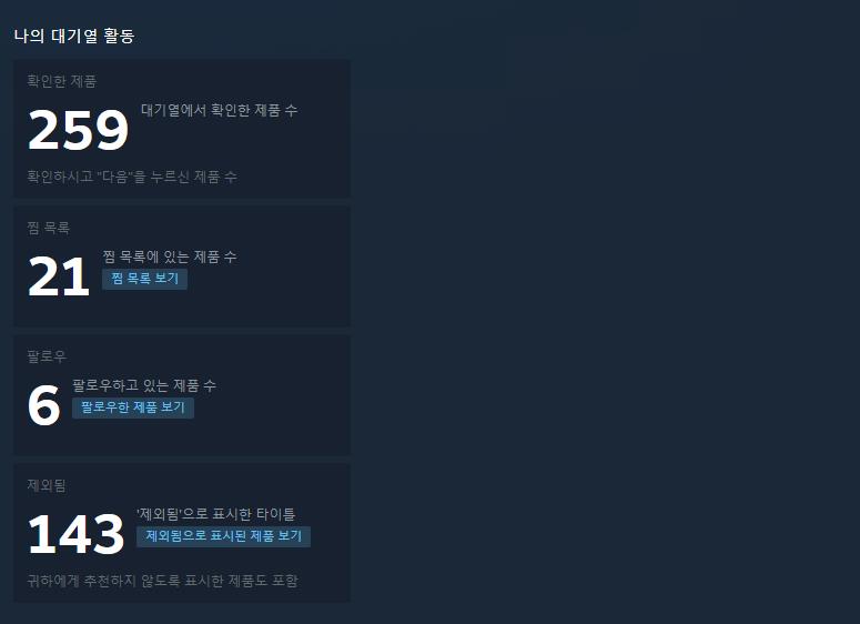 스팀에 온갖 게임이 다 있다 보니까 아마 가볍게 이용하시는 분들은 특정 게임을 구매하는 경우가 아니라면 제대로 이용해본 적이 없으실 것 같아요. 적당한 정보의 결핍이 있어야 알아가려는 노력이라도 할텐데, 오히려 너무 많은 게임들이 있으니 어려움이 있었을 것 같습니다. 하지만 걱정하지 마세요. 사진에서 보이는 ‘대기열’만 이용하시면 됩니다.