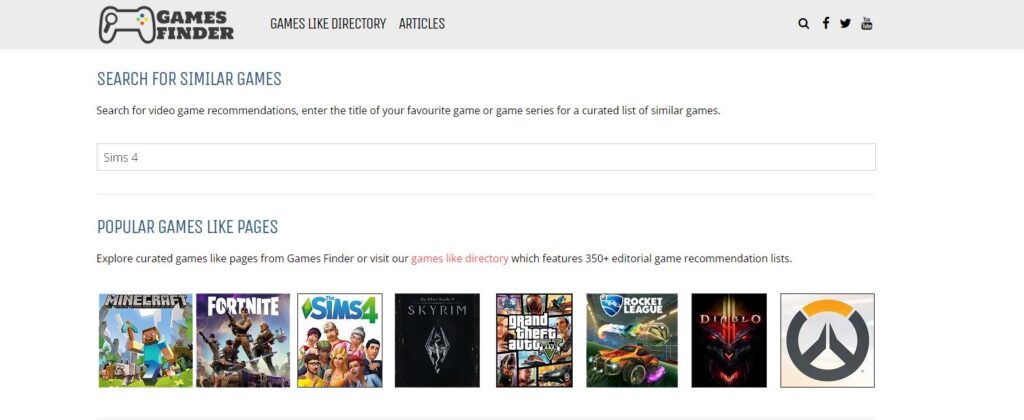 게임 추천을 받는 마지막 방법은 Games Finder를 이용하는 것입니다. Quantic Foundry와 유사하지만 조금 더 가볍게 진행할 수 있는 방법입니다. 이 방법 같은 경우 플레이 해보았던 게임을 단 한 가지만 입력하면 그와 유사한 게임들을 보여주는 방법입니다. 그렇기 때문에 게임을 많이 해보지 않았거나, 생각나는 게 몇 가지 되지 않을 때 사용해보면 좋은 방법입니다.