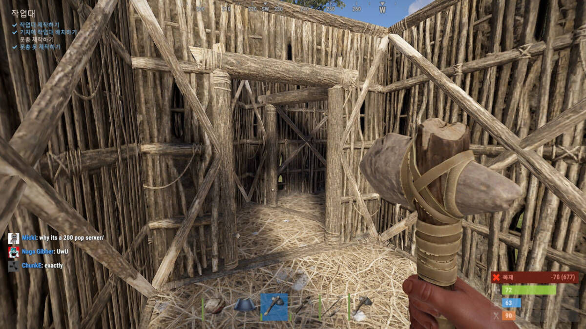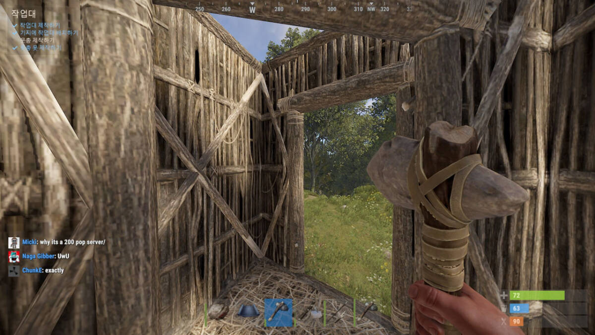 이번엔 실제 게임 안에서 보도록 하겠습니다. 삼각형 토대와 문틀을 앞 쪽에 여러 개 이용하기 때문에 일반적인 사각형 벽에 비하여 제작 비용은 물론, 강화 비용도 저렴합니다. 그렇기 때문에 초반에 제작하기에 안성맞춤입니다. 특히, 솔로 유저들에게 제일 적합한 형태라고 생각합니다.