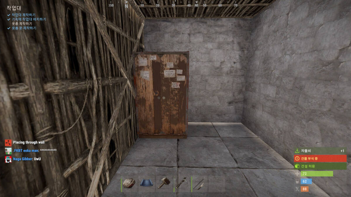 이 빌드를 사용할 때 중요한 점은 문이 바깥으로 열리게 해야 한다는 점입니다. 러스트는 교전이 빠르다 보니 부활하여 곧바로 재교전을 하러 가는 경우가 참 많습니다. 그럴 때, 너무 급한 나머지 문을 모두 열고 나가는 경우가 발생하고 외부에서 적들이 침입하기도 하죠.