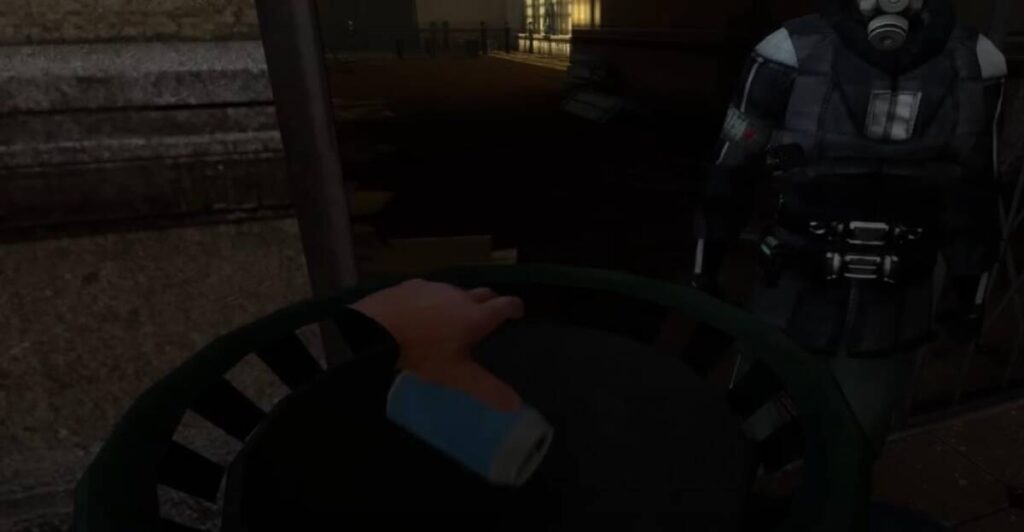 하프라이프2 VR 모드는 무엇보다도 모든 행동들이 VR 기기를 통해서 진행된다는 점이 굉장히 신선하게 다가올 것 같습니다. 위 사진은 콤바인이라고 하는 적대 세력이 쓰레기를 주인공 앞에 던져두고서는, 주워서 버리라고 하는 부분입니다. 이 때, 유저들은 마우스와 키보드를 사용했지만 이제는 VR 기기를 통해서 집는 장면이 나오며 집고 있는 손동작도 나옵니다. 본 장면과 다른 정보들로 미루어보아 이번 하프라이프2 VR 모드는 말 그대로 ‘모드’이므로 신선함은 있을지라도, 고든 프리맨(주인공)의 시점에서 게임이 진행되는 것은 똑같습니다. 게다가 그러므로 스토리 진행 대부분도 동일할 것으로 보입니다.