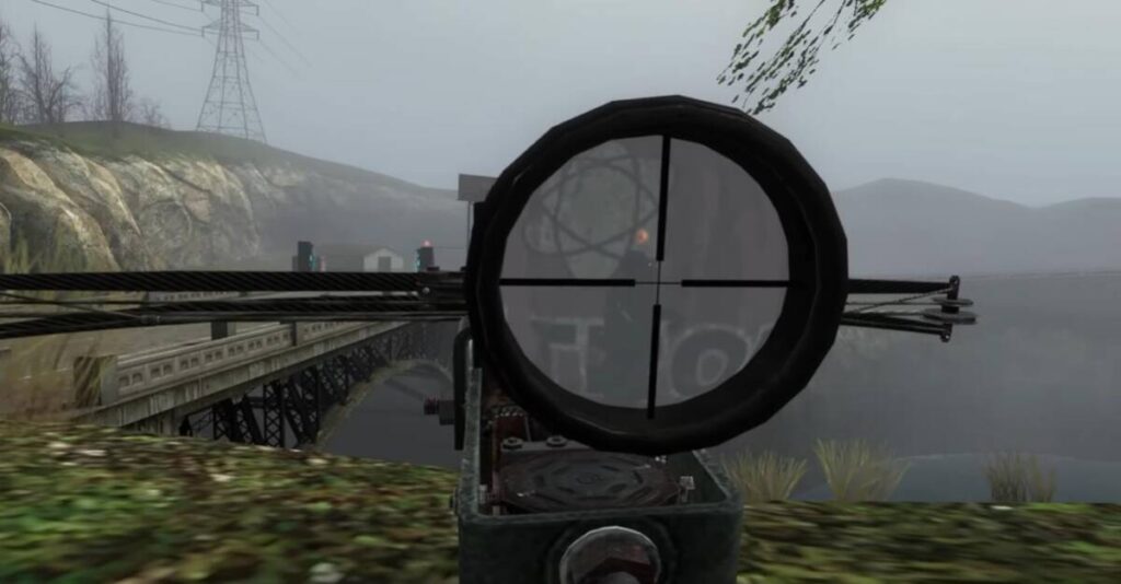또 한 가지 흥미로운 점은 크로스보우를 줌할 때 ‘조준경’을 이용한다는 점입니다. 그간 하프라이프2에서 석궁의 줌을 이용할 때는 화면이 앞으로 당겨지기만 했던 것으로 기억합니다. 하지만 하프라이프 2 VR 모드에서는 십자선이 그려진 ‘조준경’을 이용해서 적을 타격할 것으로 예상됩니다.