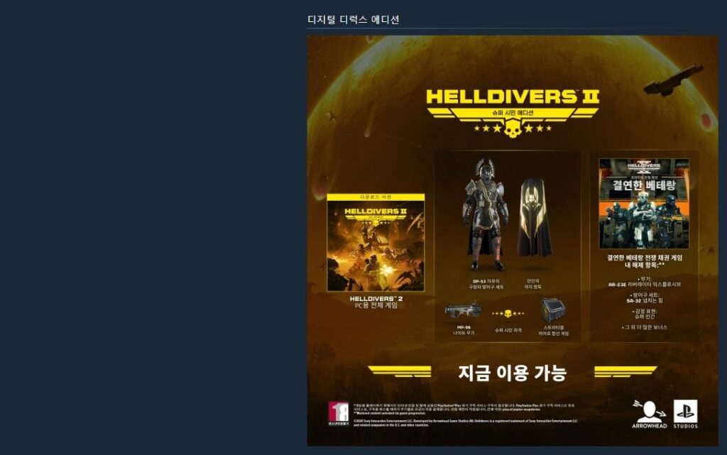 혹시나 헬다이버즈 2 구매를 계획하고 계신 분들은 ‘슈퍼 시민 에디션’을 추천드립니다. 아직까지 많은 업데이트가 있지는 않지만 이들은 ‘전쟁 채권’이라고 하는 언락 시스템에서 단독적으로 사용할 수 있는 탭이 존재합니다. 그리고 거기에서 나타나는 무기나 특전 등의 능력치가 나쁘지 않은 편입니다.