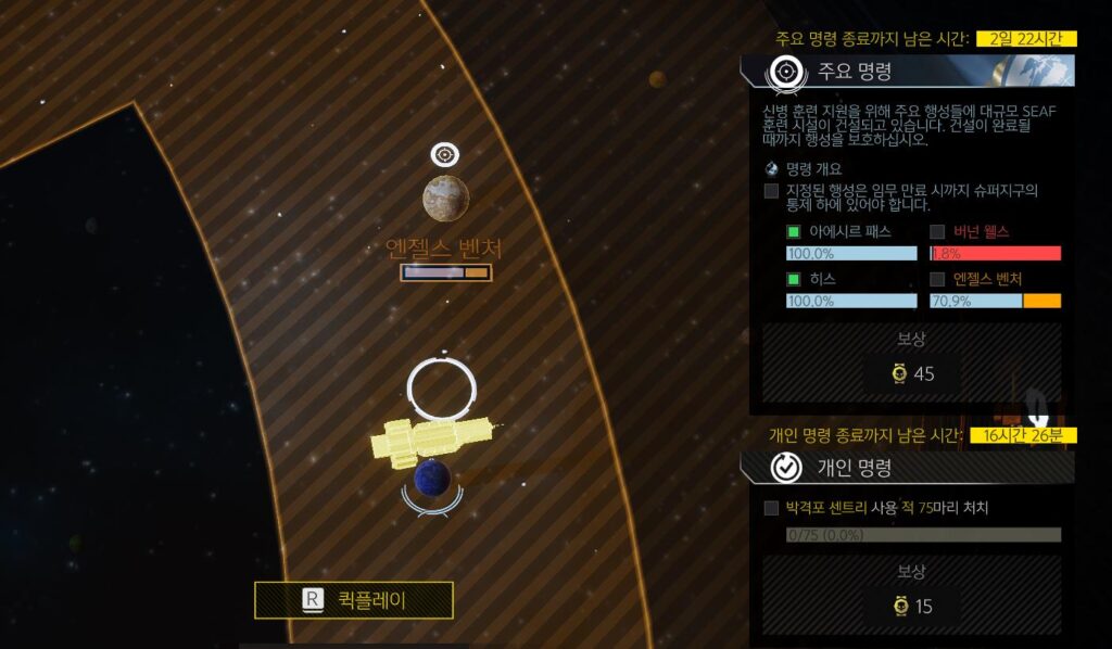 개인 명령은 말 그대로 개개인에게 하달되는 과제인데요. 과제를 완수할 경우 보상이 주어지기 때문에 늘 체크하는 것이 좋습니다. 만약 시간이 남는다면 주요 명령도 진행하여 퍼센트에 기여하는 것이 좋겠죠!