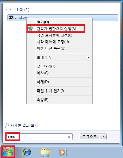 화면 좌측 하단의 윈도우 버튼을 누른 후, cmd를 검색합니다. cmd.exe라는 프로그램이 검색될텐데, 이것을 우클릭해 ‘관리자 권한으로 실행’해줍니다.
