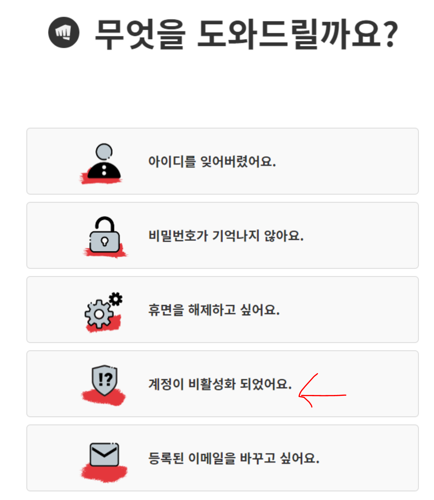 ‘계정이 비활성화 되었어요’를 클릭하면, 본인확인 페이지로 넘어갑니다. 이 때 본인확인을 진행해 주고 계정을 활성화 시키면 문제 해결!