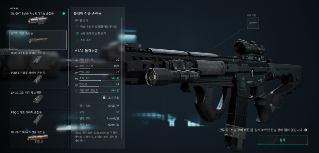 특히, 델타포스 손전등 사용으로 인해서 감소되는 스탯을 보완해야 하기 때문에 고레벨의 총기 사용도 필수적이라고 볼 수 있는데요. 총기 레벨이 낮을 때에는 오히려 손전등 사용을 ‘지양’ 하는 걸 추천드립니다. 다만, 앞서 이야기하였듯 플러드라이트 기능이 있는 경우에는 1개만 사용하더라도 유의미합니다!