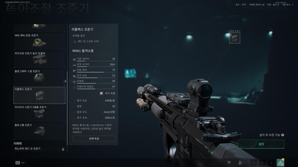 조준경은 취향 차이이기 때문에 원하시는 걸 사용하시면 되는데요. 하지만 손전등을 쓰겠다는 이야기는 중-근거리에서 이점을 취하겠다는 이야기이므로 리플렉스, 도트, 홀로 등을 사용하는 걸 추천드립니다.