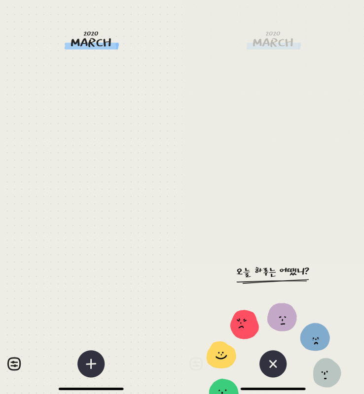 화면 상단에 앙증맞은 폰트로(설정에서 변경 가능) 올해, 이번 달이 표기돼 있구요, 하단의 + 모양 버튼을 누르면 ‘오늘 하루는 어땠니?’라는 문구와 함께 끄앙!! 넘모 기요운 표정 아이콘이 팝업된답니다!