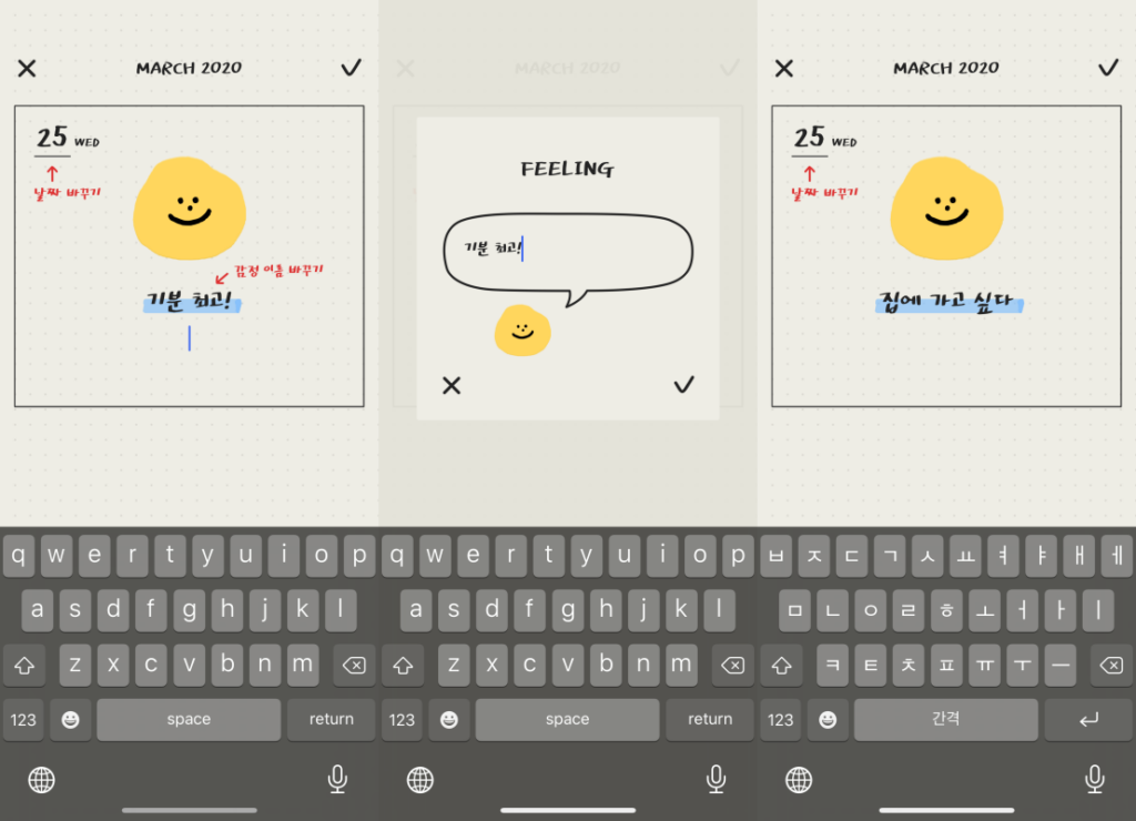 아니 근뎈ㅋㅋㅋ 감정 이름을 바꾸는 화면이 너무 귀여워요ㅠㅠ 말풍선 안에 기분 최고! 말고 다른 것을 입력해줄 수도 있답니다.