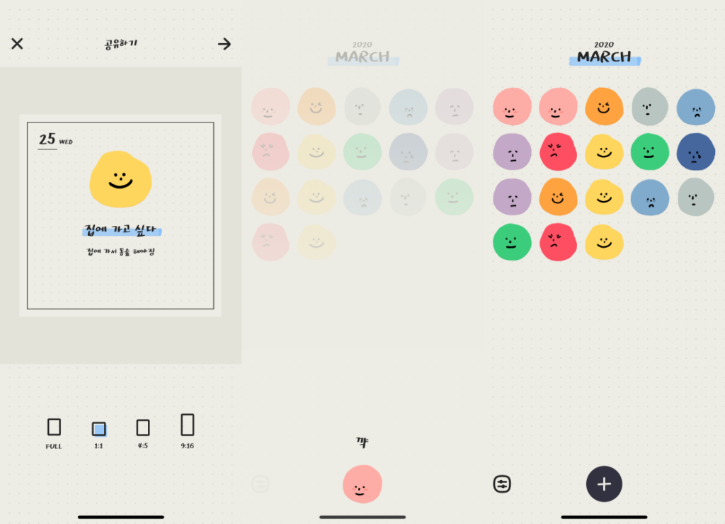 어차피 평소 일기를 길게 쓰는 편이 아니라면 오히려 이런 간단하고 직관적인 앱을 사용하는 게 더 낫겠죠? 뭣보다도 이 앱은 넘모 귀여워요ㅠㅠ 아직 한 달도 안 되는 기간 동안 사용해봤지만 하루하루 알록달록 쌓여가는 표정 아이콘을 더 수집하고 싶다는 욕구도 생기고요. 감정(표정)과 색깔의 조합이 픽사의 ‘인사이드 아웃’을 떠올리게 하는 것 같기도?