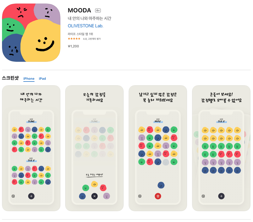 iOS 앱스토어 인기 순위 상위권을 차지하고 있는 인기 앱 중 한 가지를 에디터가 협찬 없이 직접 구매하고 사용해본 후기를 여러분께 소개해드리겠습니다! 이번 시간엔 ‘MOODA’라는 다이어리 앱이고, 가격은 1,200원이네요!
